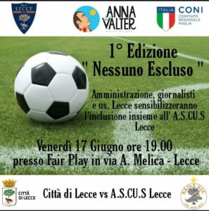 Manca meno di una settimana ad un evento sportivo del tutto eccezionale, che ha come primo obiettivo quello di sensibilizzare all’inclusione nel mondo dello sport. Il prossimo venerdì, 17 giugno, esponenti dell’amministrazione comunale di Lecce, giornalisti e l’US Lecce scenderanno in campo per disputare una partita bendati. L’evento è stato fortemente voluto dall’associazione Anna e Valter, in vista anche della presentazione della campagna di sensibilizzazione “Cuori senza limiti” a sostegno dei paratleti e contro tutte le barriere esistenti nel mondo dello sport.