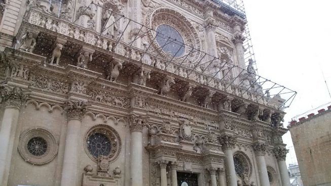 Anche nella mattinata di oggi, caratterizzata come i giorni scorsi dal gelo e dalla neve che sta coprendo il Salento, gli operai della ditta aggiudicataria dei lavori, Nicolì s.r.l., erano al lavoro per smontare alcune delle impalcature che coprono ancora la facciata.