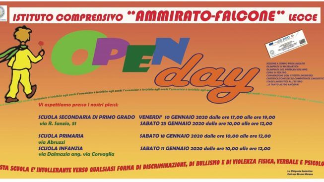 È arcinoto che gli articoli di giornale sugli Open Day, ovvero su quelle manifestazioni aperte al pubblico per divulgare virtù e requisiti delle scuole ai fini delle nuove iscrizioni, sono, nel comunicato e nel merito, preconfezionati dalle scuole stesse: veri e propri comunicati stampa. Tanto vale, allora, esporsi personalmente. E chi scrive lo fa in quanto docente di Lettere dell’Istituto Comprensivo “Ammirato Falcone” di Lecce.