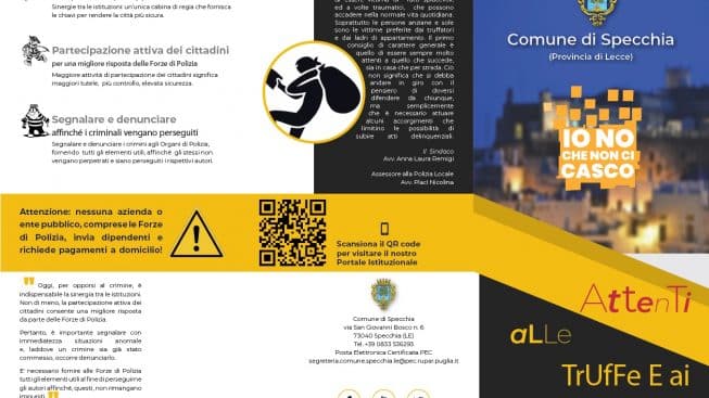 “L’obiettivo principale di questo progetto è educare e informare i cittadini sulle truffe più comuni, sviluppando maggiore consapevolezza e attenzione nelle situazioni dubbie”, ha aggiunto l’assessore alla Polizia Locale di Specchia, Nicolina Placì. “Desideriamo dotare gli anziani degli strumenti necessari per riconoscere e evitare queste frodi.”