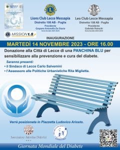 Martedì 14 novembre 2023 alle ore 16.00, il Lions Club Lecce Messapia e il Leo Club Lecce Messapia doneranno una “Panchina Blu”, per sensibilizzare alla prevenzione e cura del diabete, che sarà installata a Lecce in Piazzetta Ludovico Ariosto.