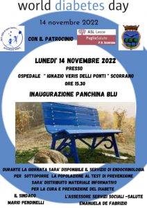 Una panchina blu per prevenire, curare e monitorare il diabete in una giornata di sensibilizzazione, divulgazione e prevenzione. Nasce con questi intenti l’iniziativa dell’associazione ‘Uniti verso un nuovo Domani…’ che si svolgerà nel pomeriggio del 14 novembre presso l’ospedale di Scorrano ‘Veris Delli Ponti’. Il tutto ovviamente nella giornata mondiale dedicata alla cura del diabete sia di Tipo 1 che di Tipo 2, ricordando che dal 20 dicembre 2006 le Nazioni Unite hanno fatto propria la necessità di sensibilizzare e informare l’opinione pubblica contro questa malattia che è una patologia cronica autoimmune che colpisce giovani e adulti in varie forme.