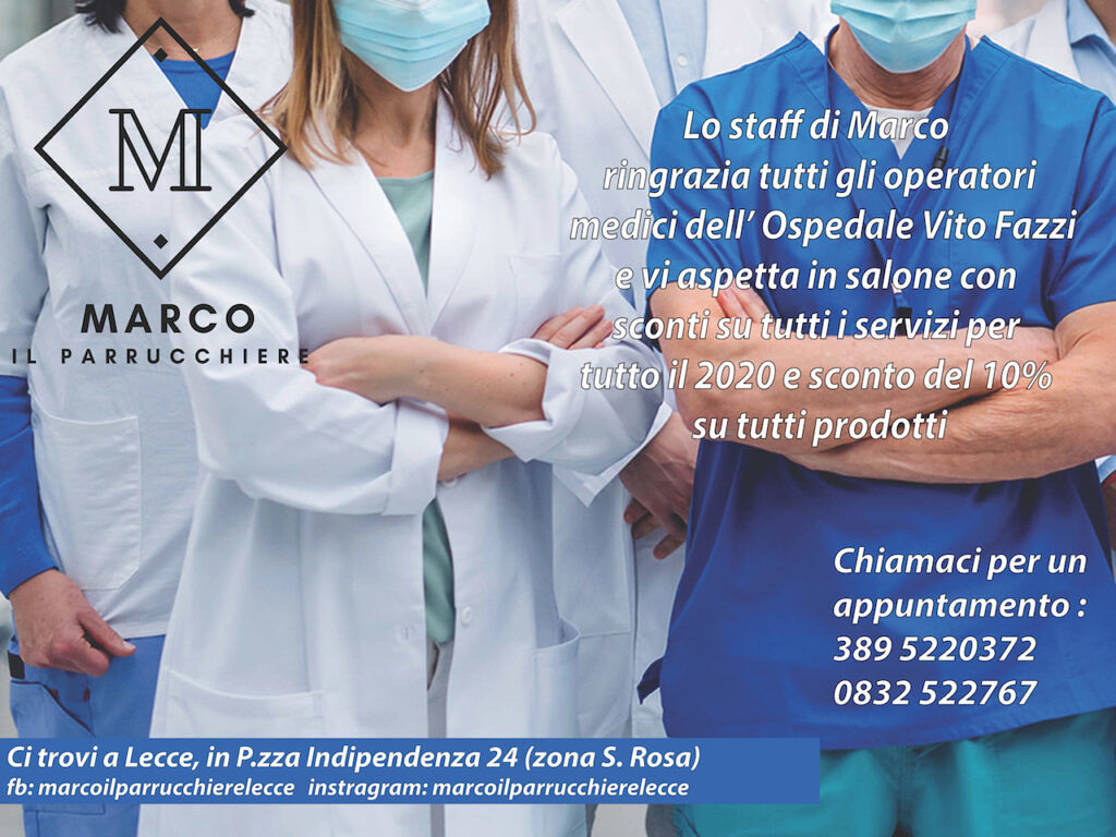 «In questo periodo difficile che abbiamo vissuto a causa del Coronavirus abbiamo avuto modo di apprezzare gli enormi sforzi dei Medici e degli Infermieri del nostro Ospedale “Vito Fazzi”, fra cui anche alcuni nostri clienti, così abbiamo pensato di trasformare questo periodo di grande sofferenza e sacrificio in una bella opportunità per inviare un messaggio di gratitudine – afferma Marco, parrucchiere e titolare dei saloni di Lecce e Milano – e, per ringraziarli per la loro abnegazione nei confronti di chi ha avuto bisogno di cure speciali, abbiamo studiato una serie di sconti a loro dedicati».