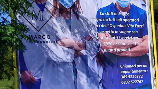 È il caso di Marco il Parrucchiere che la sua gratitudine ha preferito scriverla, pubblicamente, su dei manifesti pubblicitari affissi per le strade di Lecce. Lo slogan dei cartelloni recita testualmente così «Lo staff di Marco ringrazia tutti gli operatori medici dell’Ospedale Vito Fazzi e vi aspetta in salone con sconti su tutti i servizi per tutto il 2020 e sconto del 10% sui prodotti».