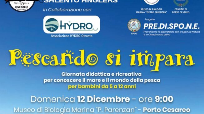 Nella giornata di domenica 12 dicembre con il patrocinio del Comune di Porto Cesareo, l’Associazione Sportiva Dilettantistica (ASD) “Salento Anglers”, il Museo di Biologia Marina “Pietro Parenzan”, in collaborazione con Associazione Hydro Otranto sulla base di un progetto della Federazione Italiana Pesca Sportiva e Attività Subacquee si svolgerà una giornata didattica e ricreativa per conoscere il mare e il mondo della pesca.