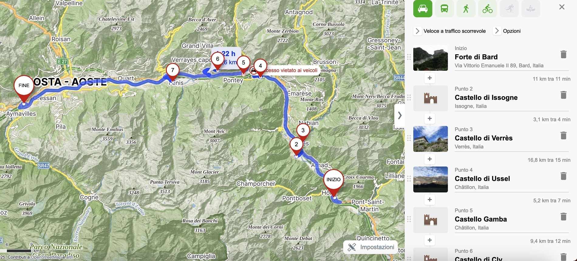 Se sei tentato da un viaggio tra gli splendidi palazzi e castelli medievali della Valle d’Aosta, abbiamo qualche consiglio per te. Questa gita può essere fatta in un solo giorno! Ti diremo come fare, quali visitare e come ti aiuterà la nuova app Mapy.com. Puoi pianificare il percorso comodamente sul tuo computer e poi inserirlo nell’applicazione. È utile per pianificare i percorsi escursionistici o per tracciare le attività a piedi e sportive grazie alla funzione Tracciatore. I conducenti possono utilizzare anche la navigazione su mappa.