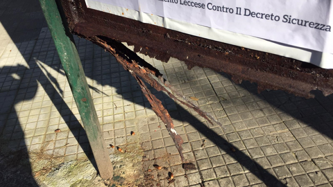 “Lo abbiamo denunciato più volte – spiega – ma pare che a Lecce cambino le amministrazioni, ma non cambia ancora il livello d’attenzione verso la tutela del decoro urbano e della prevenzione di eventuali pericoli. La prova è data dal fatto che le plance per la pubblicità in ferro, installate sui marciapiedi, sono arrugginite con i residui corrosi dei ferri che compongono il telaio, che distaccatisi dalla struttura, affilati ed appuntiti come un’arma bianca, rappresentano un vero rischio per i pedoni e soprattutto per i bambini che per giocare ci passano sotto.