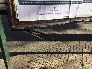 Ruggine, pezzi di ferro pericolanti e nessun segnale di cautela. “Un serio rischio per i pedoni e per i bambini. Perchè non usare strutture più leggere?“, si chiede Giovanni D’Agata, Presidente dello Sportello.