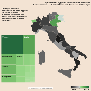 Non è solo la Puglia a fare male, ma quasi tutte le Regioni italiane. Sono 1.279 i posti letto aggiunti a quelli pre-covid, facendo salire il numero totale a 6.458 (contro gli 8.732 previsti). Ma a preoccupare ancora di più è la distribuzione delle aggiunte: un quarto dei nuovi posti letto si trovano negli ospedali veneti, portando la Regione amministrata da Zaia ad avere 16,8 letti in terapia intensiva per 100mila abitanti, ben oltre l’obiettivo. Solo Valle d’Aosta e Friuli-Venezia Giulia sono riuscite a seguire il Veneto con, rispettivamente, 15,9 e 14,4 posti per 100mila abitanti.