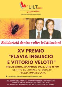 A due anni di distanza dall’ultima edizione, con una pausa forzata dalla pandemia, torna il “Premio Flavia Inguscio e Vittorio Velotti”, organizzato dalla sezione provinciale e dalla delegazione di Melissano della Lilt (Lega Italiana per la Lotta contro i Tumori). L’appuntamento è per oggi, 30 aprile, alle ore 18, presso il Centro culturale “Quintino Scozzi”, in via Piazza Vecchia a Melissano.