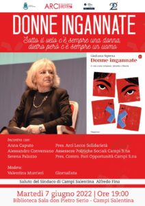 Nel pomeriggio, poi, alle ore 19, Giuliana Sgrena presenterà “Donne ingannate” a Campi Salentina, in un evento patrocinato dal Comune. Presso la sala convegni (ex biblioteca comunale) “Don Pietro Serio”, dopo un saluto del sindaco Alfredo Fina, incontrerà Serena Palazzo, presidente della Commissione Pari Opportunità di Campi Salentina, Alessandro Conversano, assessore alle politiche sociali di Campi Salentina, ed Anna Caputo, presidente di Arci Lecce Solidarietà. Modererà l’incontro la giornalista Valentina Murrieri.