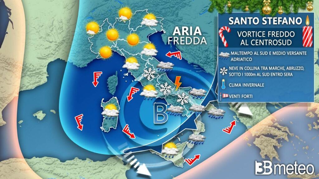 Non sarà facile rinunciare all’alta pressione che ha regalato temperature gradevoli per essere dicembre – nelle ore più calde nel Salento si sono toccati anche i 18 gradi – ma dal giorno di Santo Stefano il freddo, in arrivo dalla Russia, farà crollare l’asticella della colonnina di mercurio, anche di 10/15 gradi. L’inverno, “astronomicamente” cominciato il 21, si farà sentire e sarà talmente ‘pungente’ che toccherà armarsi di indumenti pesanti per combatterlo.