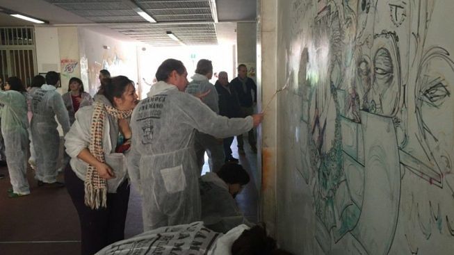 Nemmeno il tempo non propriamente soleggiato ha fermato professori e studenti dell’Università del Salento che questa mattina si sono ritrovati presso il palazzo ‘Codacci Pisanelli’, armati di pennelli e tintura bianca, per riportare quella lucentezza che nel palazzo principale dell’Ateneo salentino mancava da anni, soffocata da scritte sui muri sparse qua e là.