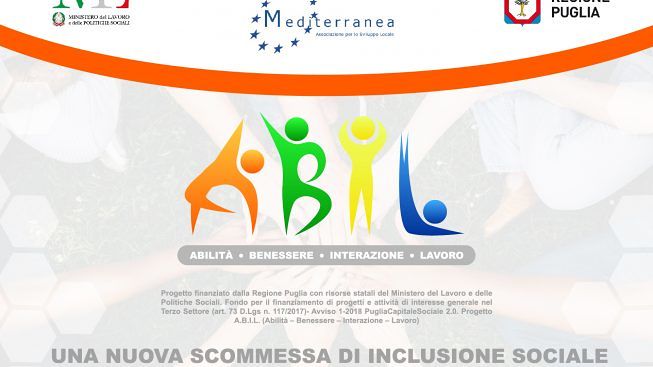 Mediterranea Associazione per lo Sviluppo Locale, in partenariato con il Dipartimento di Scienze Motorie dell’Università di Bari, CSEN (Ente di promozione sportiva) e Ambito territoriale di Gallipoli, presenta il Progetto A.B.I.L. (Abilità – Benessere – Interazione – Lavoro), finanziato dalla Regione Puglia nell’ambito dell’Avviso “Puglia Capitale Sociale 2.0”.
