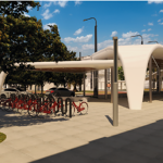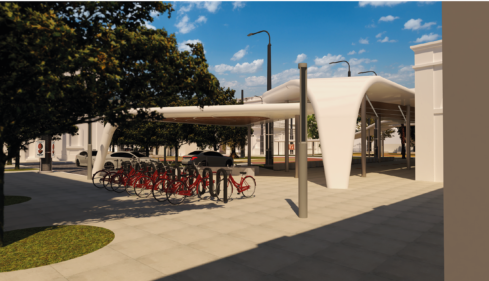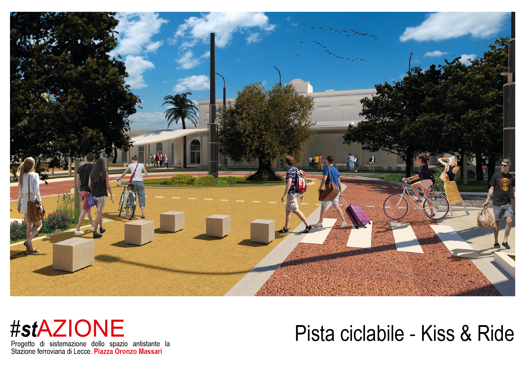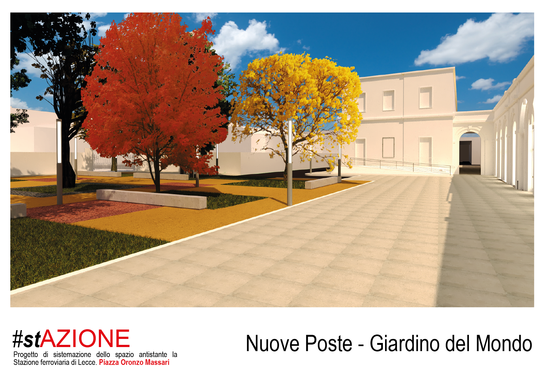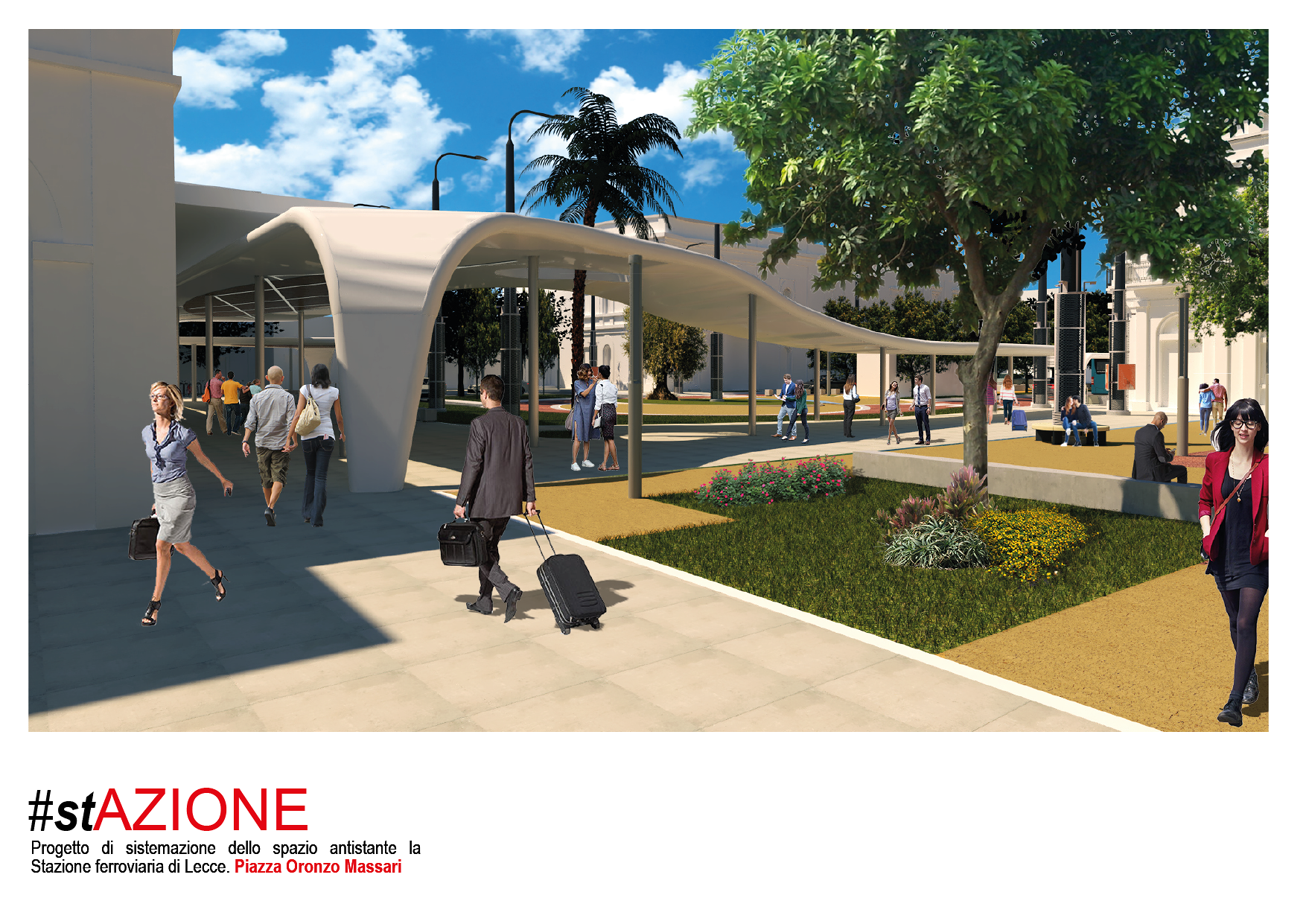 I viaggiatori saranno accolti all’uscita dalla stazione da uno spazio coperto da una moderna pensilina. Sulla destra, invece, un percorso coperto che porta alle fermate del trasporto pubblico urbano, dove due ampie pensiline coperte faranno da riparo per i viaggiatori in attesa dei mezzi. Il percorso previsto dal progetto, inoltre, costeggia il “Giardino del Mondo”, elaborato dagli studenti del quinto anno dell’Istituto Agrario “Presta-Columella”: si tratta di uno spazio alberato arricchito da essenze provenienti da vari continenti a sottolineare la vocazione del Salento all’accoglienza e al dialogo tra i popoli.