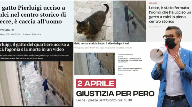 Ha fatto indignare il gesto brutale del 40enne che ha ucciso a suon di calci il gatto Pierluigi, la mascotte del centro storico di Lecce. In segno di protesta, nel pomeriggio di oggi alle 16:30, si svolgerà una manifestazione per inasprire le pene di chi maltratta gli animali. L’incontro, organizzato e promosso da Enrico Rizzi, attivista per i diritti e la tutela degli animali, è previsto a Piazza Sant’Oronzo.