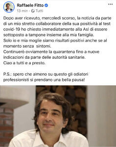 Terminata la campagna elettorale, presosi 24 ore di riposo, incassate le critiche del leader della Lega, Matteo Salvini, a cui ha prontamente replicato, Raffaele Fitto deve fare i conti con un altro problema, la positività al coronavirus.