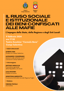 Si svolgerà nella giornata di domani, venerdì 9 febbraio , alle ore 17.30, presso il Teatro “Excelsior – Carmelo Bene” di Campi Salentina, l’evento dal titolo “Il riuso sociale ed istituzionale dei beni confiscati alle mafie“, promosso dall’Amministrazione Comunale e dalla Regione Puglia, per presentare il progetto di recupero di uno stabile confiscato alla mafia, in via Amedeo di Savoia a Campi Salentina.