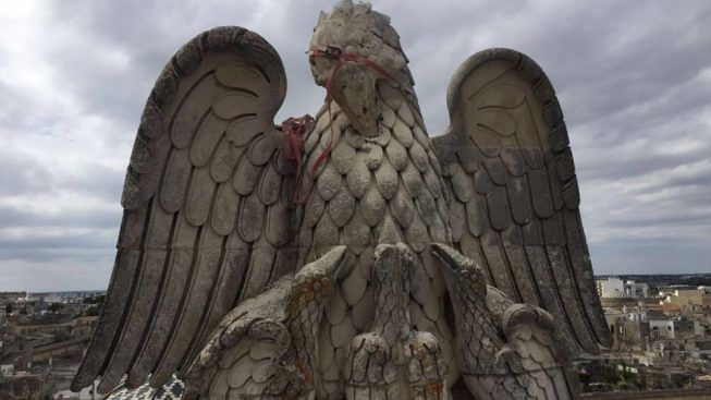 Per più di due settimane, i maestri scalpellini della ditta del geometra Luigi Marullo hanno lavorato in laboratorio per creare una copia esatta del volto e del lungo becco dell’uccello in pietra leccese che potesse combaciare con la nuca e le restanti parti della testa. Una volta raggiunto il risultato perfetto, il pezzo è stato fissato utilizzando resine epossidiche e di fibre naturali. Si tratta di tecniche innovative che garantiscono la tenuta nel tempo del restauro attraverso l’utilizzo di sostanze resinose liquide e solide in sostituzione delle tradizionali bullonature in metallo. La statua rimarrà imbracata con dei nastri di sicurezza per i prossimi giorni per permettere la solidificazione dei collanti usati. Una volta completata anche questa fase, si potrà passare alla velatura per ottenere l’uniformità cromatica del nuovo pezzo rispetto al resto della scultura.