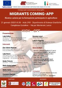 Il Dipartimento di Scienze Giuridiche dell’Università del Salento è pronto per il progetto “MIGRANTS COMING-APP. Ricerca-azione per la formazione partecipata in agricoltura”, idea nata a seguito della Convenzione sottoscritta con il FAMI (Fondo Asilo, Migrazione e Integrazione 2014-2020).