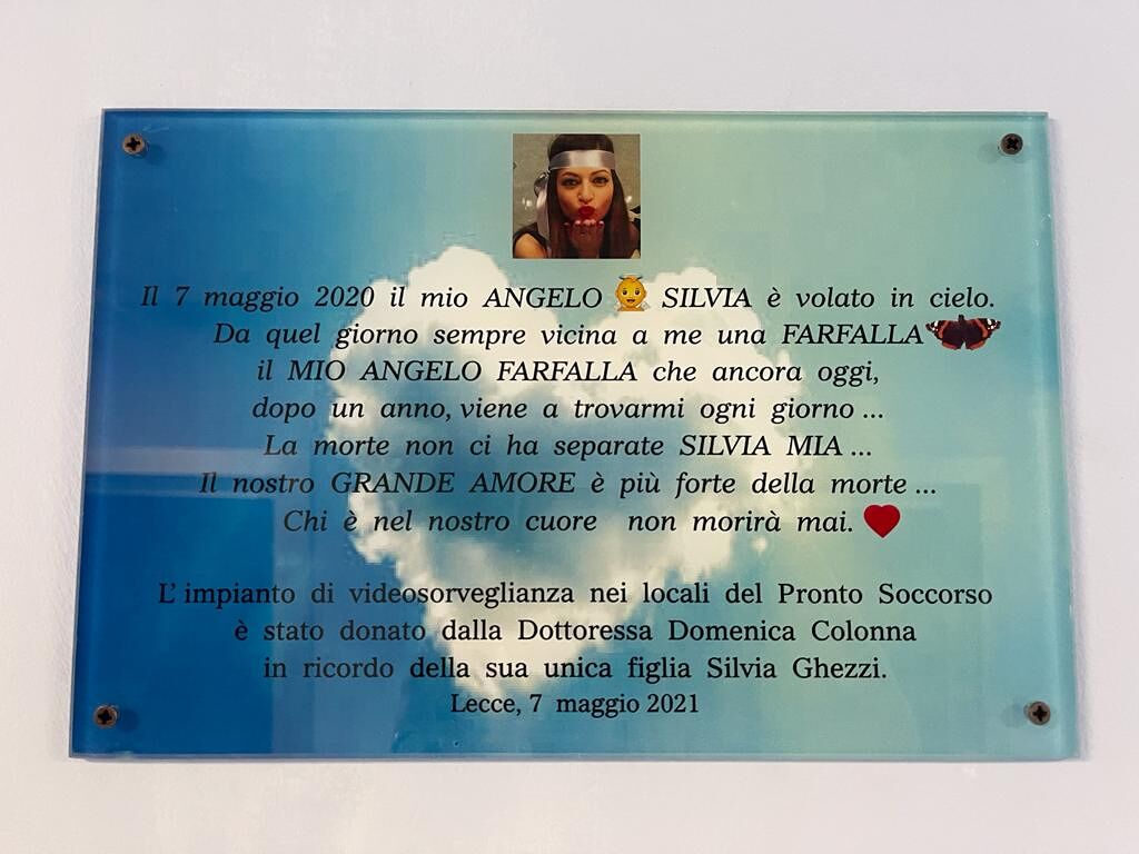 La donazione è stata accompagnata da una targhetta, apposta nei locali del pronto soccorso in ricordo della giovane ragazza. Contiene una nuvola a forma di cuore. “Un’immagine che mi è apparsa nitida nel cielo quando ti ho chiamata perché mi mancavi tanto”, dice Domenica Colonna nel ricordare la figlia. “Da quel 7 maggio sei sempre vicino a me come una farfalla, il mio angelo farfalla Silvia da un anno viene a trovarmi ogni giorno”.