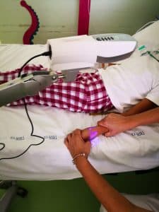 Si tratta di un illuminatore che proietta luce vicino agli infrarossi: questa viene assorbita dal sangue e riflessa dal tessuto circostante. L’informazione viene poi catturata, processata e proiettata digitalmente in tempo reale direttamente sulla superficie della pelle del bambino, fornendo un’immagine accurata del reticolo sanguigno del paziente.