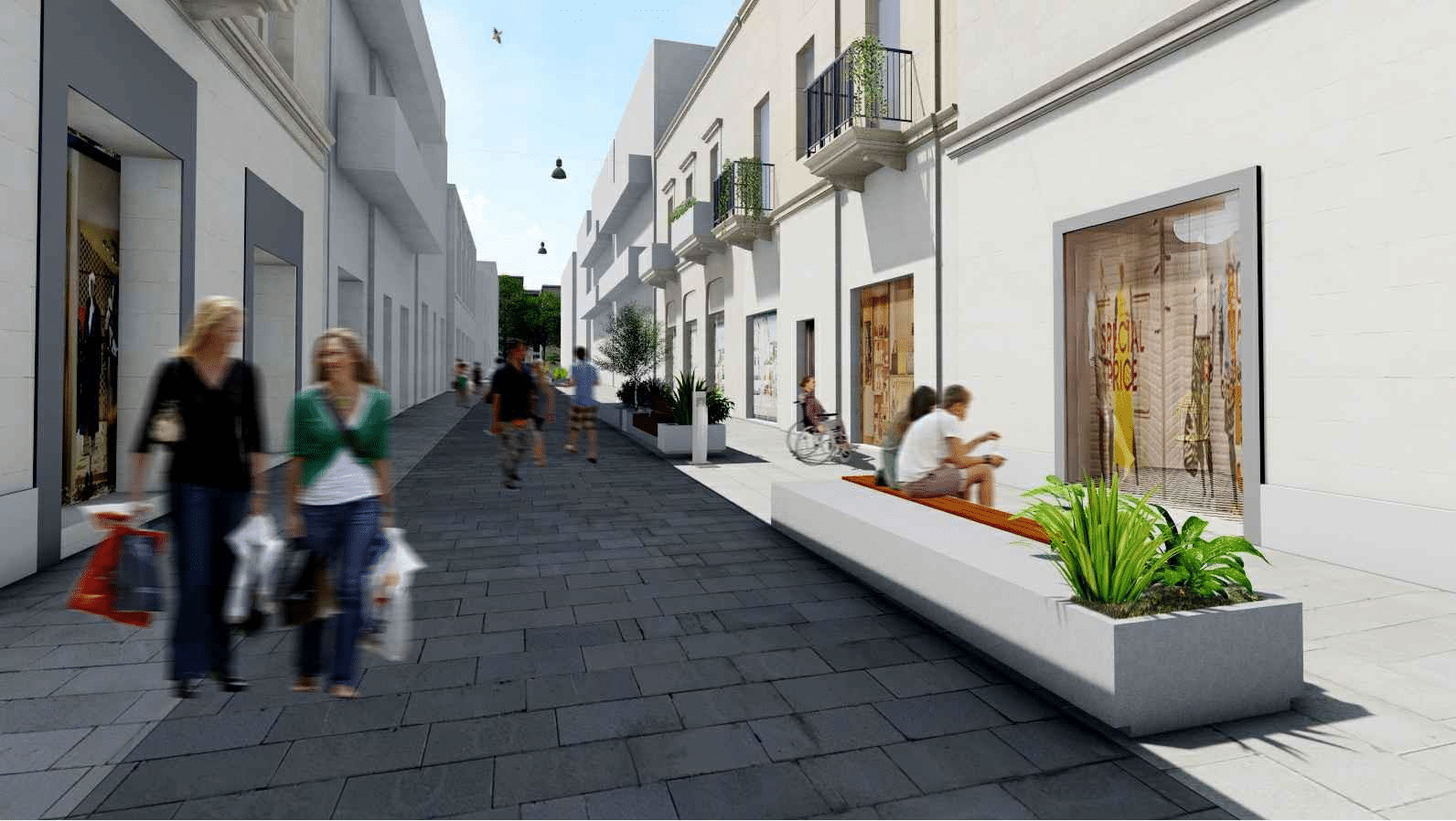 Il progetto di riqualificazione si concentrerà su quattro temi di percorrenza, sicurezza, comfort e rappresentatività. Per migliorare la percorrenza sarà rimossa la distinzione tra marciapiede e sede viaria, organizzando lo spazio in tre fasce: una dedicata ai pedoni ma percorribile dai mezzi di emergenza al bisogno; una fascia adiacente alle attività commerciali, dedicata alla sosta davanti alle vetrine; e una fascia attrezzata laterale in cui concentrare panchine e verde che non interferiranno con i flussi pedonali.