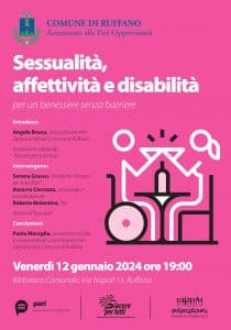 L’appuntamento, con ingresso libero, è per le ore 19.00 presso la Biblioteca Comunale di Ruffano, sita in via Napoli. Dopo i saluti dell’assessora Angela Rita Bruno, interverranno Serena Grasso, presidente della odv Piacere per tutti, Azzurra Carrozzo, sessuologa e psicoterapeuta e Roberto Molentino di Pari.
