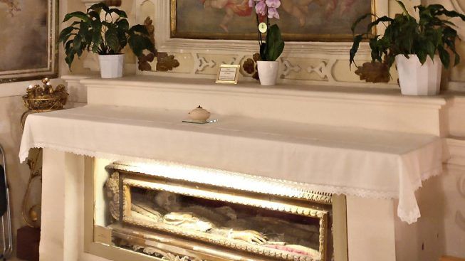 Da quel momento, dei resti del Pontefice non se ne seppe più nulla per circa un lustro fino al 24 luglio del 1659 quando, il suddetto Albricci, affidò la teca contenente il corpo del Santo all’abbadessa delle clarisse di Mesagne affinché la custodisse all’interno della chiesa della Beata Vergine della Luce attigua al loro monastero. Le reliquie del Papa furono, quindi, poste sotto un altare sulla cui sommità sovrastava una tela(andata persa) ritraente la Madonna dove rimase fino ai primi anni del XX secolo.