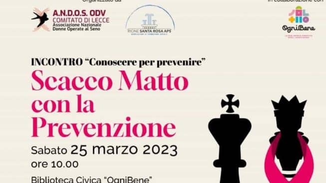 Si svolgerà sabato 25 marzo, a partire dalle 10.00, presso la Biblioteca OgniBene, l’iniziativa dal titolo “Scacco Matto con la Prevenzione”, sarà occasione nella quale le due associazioni attive sul territorio leccese, sempre attente al sociale e al benessere della comunità, metteranno a disposizione da un lato medici volontari per approfondire le ‘mosse’ giuste per la prevenzione oncologica e dall’altro i maestri di scacchi per chi desiderasse conoscere o approfondire la conoscenza della nobile disciplina.