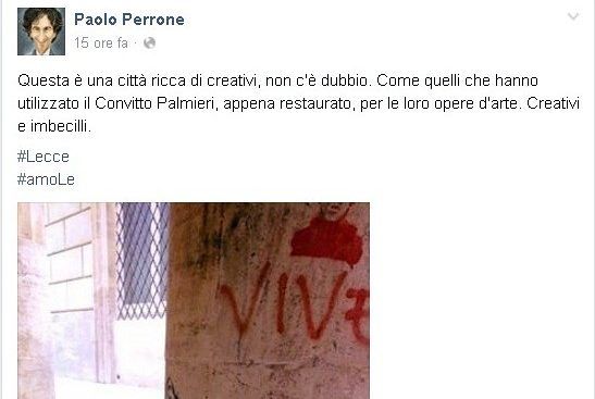 Sì, perché non di arte si tratta giacché, l’arte, si prefigge la crescita culturale comune, non il degrado, e il primo a non usare mezzi termini sull’accaduto è stato proprio il primo cittadino del capoluogo salentino, Paolo Perrone, che, ricordando come Lecce sia indubbiamente “una città ricca di creativi” non ha esitato a definire sarcasticamente, e a buona ragione, gli autori del gesto dei “creativi imbecilli”.