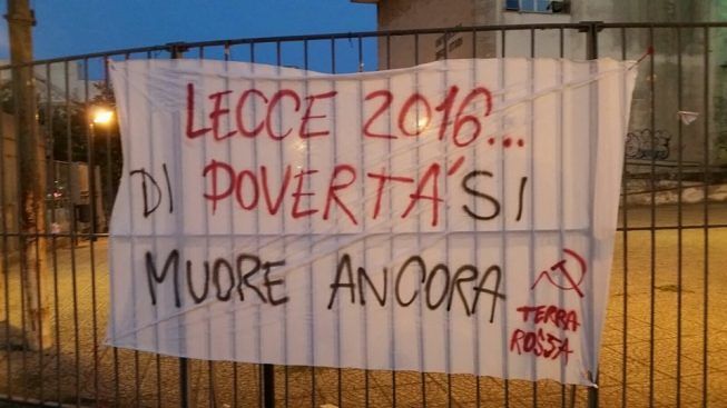 Non è andato giù, al collettivo Terra Rossa, che Lecce si sia vestita a festa in onore dei santi patroni Oronzo, Giusto e Fortunato. Soltanto qualche giorno fa, il capoluogo barocco piangeva per la morte del senzatetto Giuseppe Fiorentino, trovato privo di vita in un casolare abbandonato di via Taranto. Quello di Giuseppe era un volto noto in città. In un gioco crudele del destino era stato lui a scoprire, nell’inverno del 2014, i corpi Dino Martina e Veronica Piggini, precipitati nella cisterna dell’abitazione in cui avevano trovato rifugio.