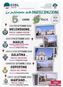 In preparazione del percorso che porta la Cisl nelle giornate del 13 e 14 ottobre alla Festa della Partecipazione, una mobilitazione nazionale in tutte le città d’Italia, la Segreteria provinciale della Cisl di Lecce ha organizzato dal 18 al 23 settembre 2023 “La settimana della Partecipazione” che si è articolata in cinque incontri nelle piazze di alcuni dei maggiori comuni del Salento, per illustrare ai cittadini i contenuti dell’iniziativa della Cisl al fine di massimizzare le adesioni alla proposta di Legge di iniziativa popolare sulla Partecipazione.