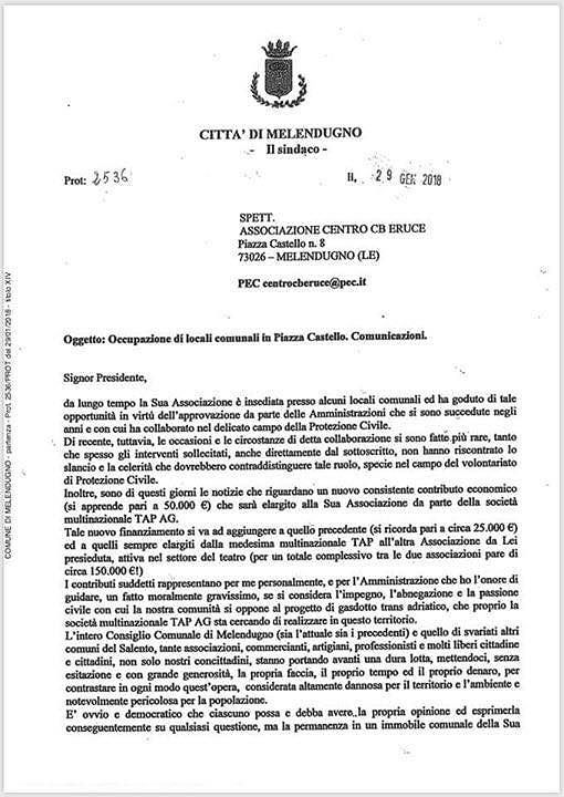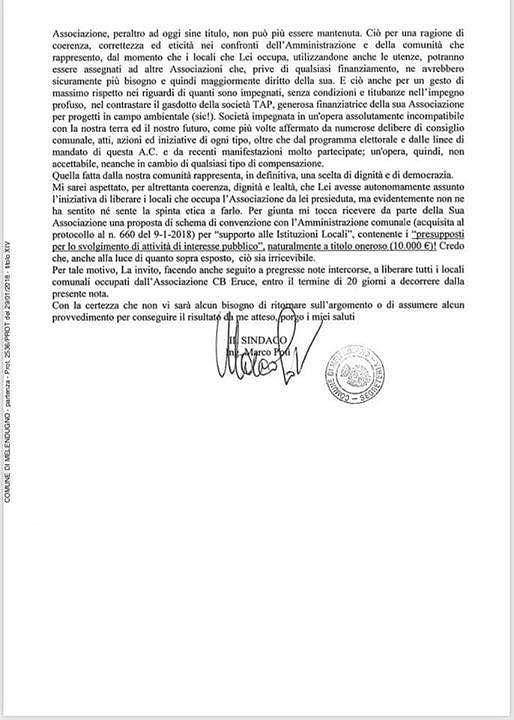 «Nella sua lettera il Sindaco non accampa scuse, non si trincera dietro affitti non pagati o necessità di recuperare i locali. Con una certa brutalità, mette nero su bianco che solo chi condivide la battaglia contro il gasdotto ha diritto a utilizzare uno spazio pubblico. Fosse anche per la più nobile delle cause», si legge nel pezzo, ma Potì non ci sta a passare per quello che maltratta i volontari e pubblicamente, sul suo profilo Facebook rende nota la lettera inviata al Presidente dell’associazione con cui si chiede di liberare i locali di piazza Castello per “motivazioni di carattere etico-morale”.