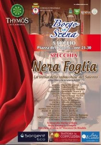 Continua con successo “Borgo”, la rassegna musico-teatrale promossa da Accademia Thymós di Specchia e diretta dal M° Vincenza De Rinaldis e sostenuta dal Consiglio Regionale della Puglia. La rassegna, inoltre, è in collaborazione con il comune di Specchia, Tèmenos recinti teatrali e Spazio Teatro. Ad andare in scena il prossimo 9 luglio, presso Piazza del Popolo a Specchia, alle ore 21.30, è Nera foglia (la storia delle tabacchine del Salento).