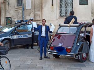 È così l’agente della Polizia Locale ha multato l’autovettura che parcheggiava nel salotto buono della città di Lecce nel mentre gli accompagnatori facevano scendere i novelli sposi per la sfilata di rito nel centro di Lecce in cui scattare le foto più belle del loro servizio fotografico prima di recarsi nel locale in cui è previsto il ricevimento.