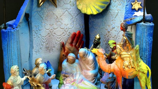 E’ nei ricordi di bambina che affonda l’ispirazione per i presepi, realizzati come teatrini scenografici, memoria della manualità scultorea del padre, allievo di Arturo Martini, e delle marionette che la mamma confezionava. E brillano gli occhi di bambina quando nel 1944 il padre allestì un presepe su più tavoli nel salotto della casa romana: ruscelli, pastori, angeli musicanti, animali. La memoria infantile ha guidato i suoi presepi creati con colori sgargianti, ambientati nella tradizione ma reinventati con incrostazioni, conchiglie, soli, colori, ambientazioni favolistiche e presenze mute: rimane intatta l’iconografia sacra, la tradizione simbolica della Sacra Famiglia a suggellare la continuità con l’immaginario collettivo. Così l’anima pop di Giosetta Fioroni non regredisce nemmeno difronte alla favola del presepe ma anzi ne vivifica il suo tratto comunicativo.