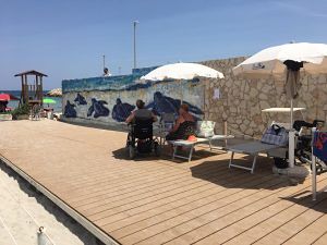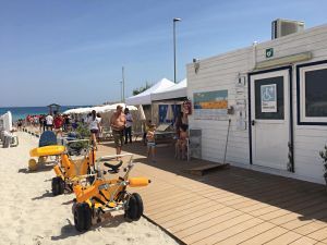 Sono presenti 3 postazioni con colonnina acqua/elettricità per gli ospiti che necessitano di ventilazione assistita e 6 postazioni per le altre forme di disabilità, 2 bagni completamente attrezzati con doccia calda e 2 docce esterne. Ogni postazione è provvista di lettini ribassati, sedie da regista e idonea ombreggiatura. Completa la struttura una ampia passerella che consente l’agevole spostamento con la sedia a rotelle.