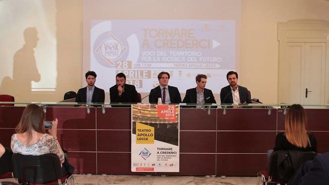 Si è tenuta questa mattina presso l’Open Space di Palazzo Carafa la conferenza stampa di presentazione della manifestazione “Tornare a crederci – Voci del territorio per la ricerca del futuro”, organizzata dall’associazione giovanile Vox Populi, in collaborazione con il Club Lions e Leo Lecce Messapia. L’evento, patrocinato dal Comune di Lecce, si terrà sabato 28 aprile alle ore 17 presso il teatro Apollo.