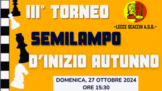 Il circolo FSI Lecce Scacchi ASD, in collaborazione con la Parrocchia di San Sabino, ha organizzato il III° Semilampo S. Sabino – d’Inizio Autunno. Un evento imperdibile per tutti gli appassionati di scacchi, dai principianti agli esperti.