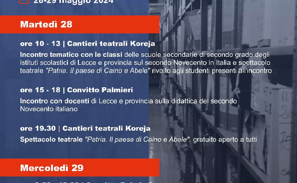 Sono ancora aperte le candidature per la partecipazione all’incontro della mattina del 28 maggio (ore 10-13), presso i Cantieri teatrali Koreja, rivolto agli Istituti secondari di secondo grado di Lecce e provincia, durante il quale si potrà assistere gratuitamente allo spettacolo teatrale Patria. Il paese di Caino e Abele, coproduzione del Centro Teatrale MaMiMò di Reggio Emilia e Eco di Fondo di Milano. Lo spettacolo, gratuito e aperto a tutti, sarà riproposto nella stessa sede alle ore 19.30. Ancora possibile prenotare la propria presenza anche per l’incontro, previsto nel pomeriggio dello stesso giorno (ore 15-18) presso il Convitto Palmieri, destinato a docenti che operano sul territorio.