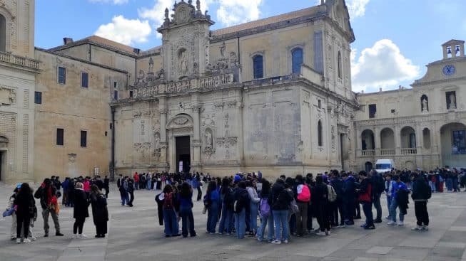 Guardate Piazza Duomo a Lecce, sembra il palcoscenico ideale delle gite scolastiche, una cornice degna della migliore tradizione turistica di primavera.