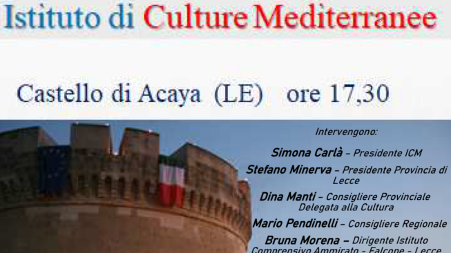 “Un anno insieme” si chiama così l’iniziativa in programma sabato 18 dicembre, a partire dalle ore 17.30, nel castello di Acaya, promossa dall’Associazione Istituto di Culture mediterranee della Provincia di Lecce, che rappresenta, come lo definisce il presidente della Provincia Stefano Minerva “l’organismo motore della tutela e della diffusione della cultura dell’area mediterranea”.