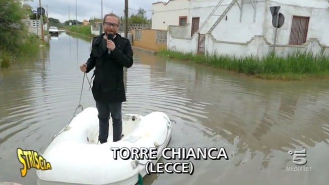 Pinuccio il celebre inviato pugliese di ‘Striscia la Notizia’ torna in Salento: «Carissimi Amici, non sono a Venezia ma a Torre Chianca, marina di Lecce. Qui ha piovuto per mezz’ora e adesso sto andando a prendere (con un gommone gonfiabile) Daniele che non può uscire di casa». Inizia con queste parole, il servizio del programma di punta del prime-time di Canale5 (andato in onda ieri, due giugno), in cui si sono accesi i riflettori sui problemi della cittadina a due passi dal capoluogo barocco.