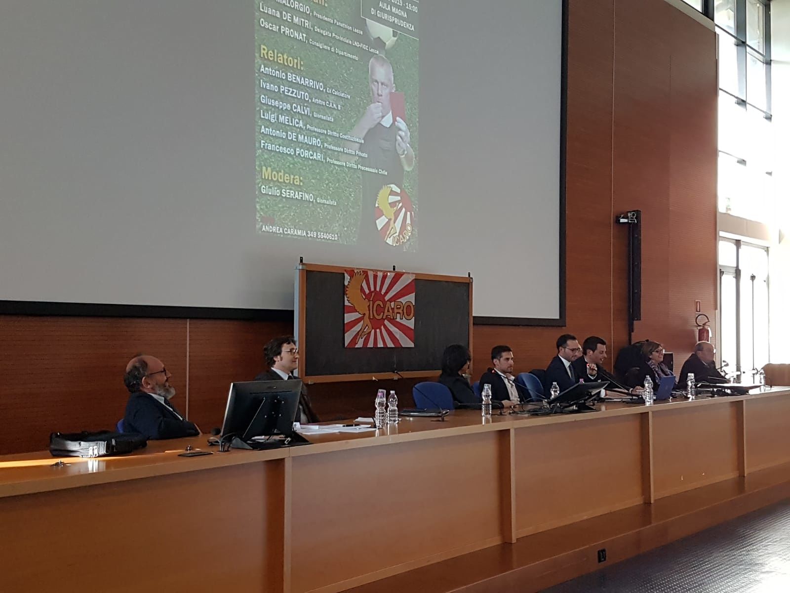 La notizia, come detto, è stata lanciata ieri pomeriggio durante l’ennesimo appuntamento seminariale sullo sport presso la facoltà di Giurisprudenza: moderato dal giornalista della nostra testata Giulio Serafino, infatti, si è svolta ieri la seconda edizione di “Giustizia Sportiva e Fair Play”. Organizzato dall’associazione studentesca “Icaro”, all’appuntamento hanno partecipato l’arbitro leccese di Serie B Ivano Pezzuto, l’ex calciatore, vicecampione del mondo, Antonio Benarrivo, il giornalista della Gazzetta dello Sport Giuseppe Calvi, i professori Antonio De Mauro (docente di Diritto Privato), Francesco Porcari (Diritto Processuale Civile) e Giulio De Simone (Diritto Penale). Insieme a loro anche l’Avv. Luana De Mitri, delegata provinciale FIGC-LND e Ludovico Malorgio, presidente del Panathlon Club Lecce.