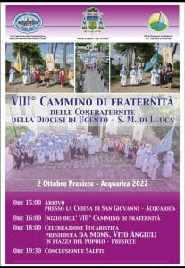 Si svolgerà nel pomeriggio domenica 2 ottobre l’ “VIII Cammino di Fraternità delle Confraternite”. Ad organizzare è la Diocesi di Ugento – S. Maria di Leuca e l’Ufficio Diocesano delle Confraternite, con il Patrocinio della Confederazione delle Confraternite delle Diocesi d’Italia, in collaborazione con il Comune e la Polizia locale di Presicce – Acquarica.