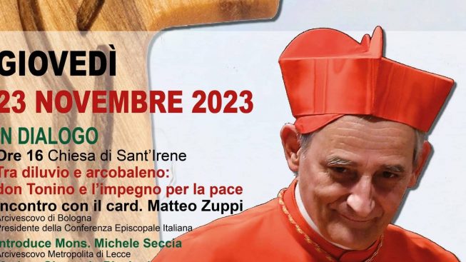 Nla giornata di domani, giovedì 23 novembre, alle 16, il Cardinale sarà nella chiesa di Sant’Irene e interverrà in un incontro dal titolo “Tra diluvio e arcobaleno: don Tonino e l’impegno per la pace”, un evento organizzato dalla diocesi in collaborazione con la Fondazione don Tonino Bello.