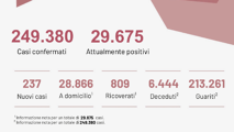 Secondo il bollettino epidemiologico sono 237 i casi positivi scoperti in Puglia su 8.797 tamponi. 58 contagi in provincia di Lecce che registra anche 5 vittime (su 16 decessi).