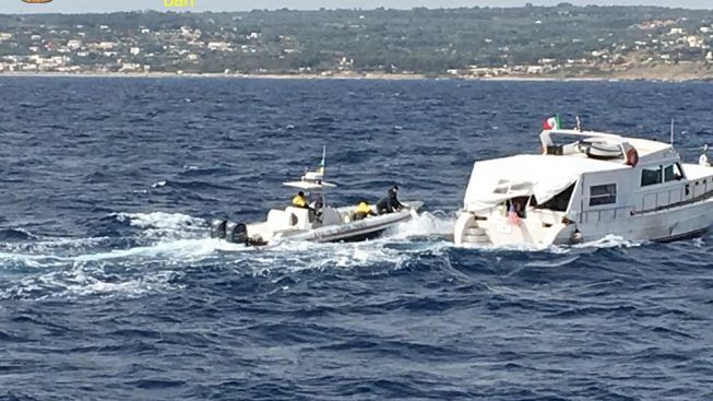 Lo yacht è stato affiancato alle 15.00 da un guardacoste del Gruppo Aeronavale della Guardia di Finanza di Taranto, da un gommone del ROAN della Guardia di Finanza di Bari e da una motovedetta della Guardia Costiera di Gallipoli.