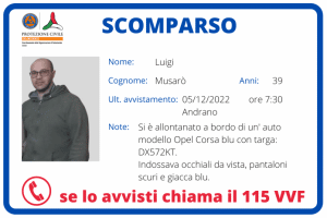 Sono ore di ansia e preoccupazione per la famiglia di Luigi Musarò, 39enne di Andrano scomparso nel nulla da lunedì, 5 dicembre. L’ultima volta che è stato visto l’orologio aveva da poco segnato le 7.30. Occhiali da vista, pantaloni scuri e giacca blu, ha lasciato alle spalle la sua abitazione e si è messo al volate di una Opel Corsa scura. Da quel momento del giovane, descritto da tutti come un bravo ragazzo non si hanno più notizie.